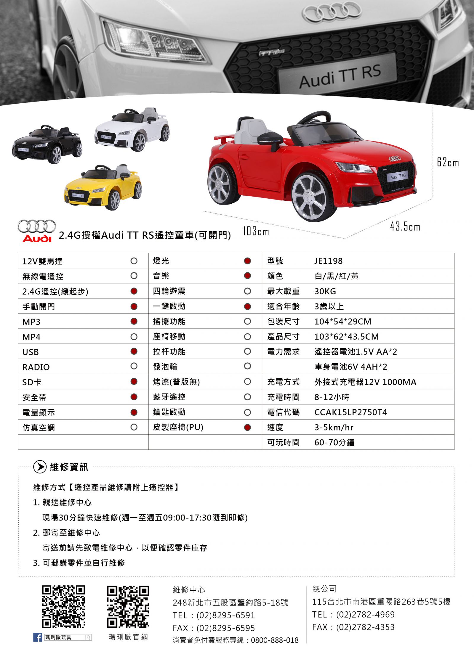 【型號JE1198】License car Audi T T RS 童車
